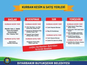 Diyarbakır Büyükşehir Belediyesi, vatandaşların Kurban Bayramı’nda kurbanlarını sağlıklı ve hijyenik bir ortamda kesebilmesi için kurban satış ve kesim yerlerini belirledi. Kurban kesim yerleri,“Sur ilçesinde, Mardin yolu üzeri Büyükşehir Belediyesi Canlı Hayvan Borsası, Mardin yolu üzeri MAY-ET Kombinası; Yenişehir ilçesinde, Seyrantepe TOKİ 1’inci etap idare binası arkası, Üçkuyular TOKİ sabit semt pazarı, Ofis Kurdoğlu Lojmanları alanı içindeki beton saha, Şehitlik İlçe Otogarı karşısı kömür tevzi sahası, Mehmet Akif Ersoy Bulvarı Carrefur Otoparkı; Bağlar ilçesinde, Mardin yolu üzeri 2.Hava Taktik Kuvvet Komutanlığı oto yıkma yeri; Kayapınar ilçesinde, Şanlıurfa yolu üzeri Emniyet Lojmanları eski ısıtma sistem binası yanı, Kayapınar Belediyesi Köy Ürünleri Pazar Yeri ve Organik Tarım Pazarı (Medya Mahallesi 633/2)” olarak belirlendi.