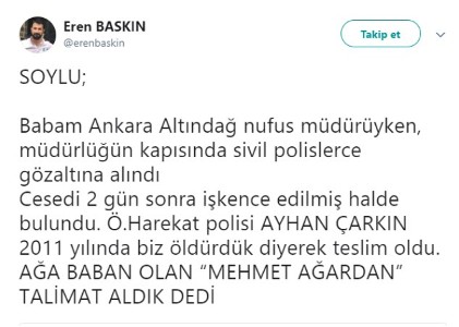 Eren Baskın Twitter hesabından yaptığı paylaşımda, "Soylu; Babam Ankara Altındağ Nüfus Müdürü'yken, müdürlüğün kapısında sivil polislerce gözaltına alındı Cesedi 2 gün sonra işkence edilmiş halde bulundu. Özel Harekat polisi Ayhan Çarkın 2011 yılında 'Biz öldürdük' diyerek teslim oldu. Ağa baban olan Mehmet Ağar'dan talimat aldık' dedi." ifadelerini kullandı.