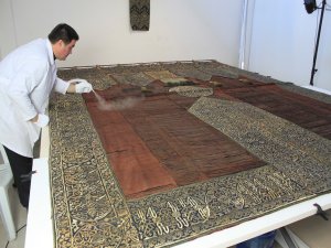 Eserin çok kırılgan bir yapıya sahip olduğunu anlatan İnan, "Şu anda kumaşın üzerinde biriken tozları buhar sistemini ile alıyoruz. Parçalanmış alanlardaki kumaşların orijinallerini bularak yerine sabitlemeye çalıştık. Esas kumaşa hiç dokunmadan çalışmamızı tamamladık. Son olarak malzemenin üzerinde biriken kalıntıların tamamını mikro ve makro aspirasyon cihazları yoluyla yok etme aşamasındayız. Eski ve kritik bir eser olduğundan dolayı, Vakıflar Bölge Müdürlüğü, konusunda uzman firmalar ile görüşerek, Kabe örtüsünü eski ihtişamı ile Ulucami’de sergileyecek” diye konuştu.