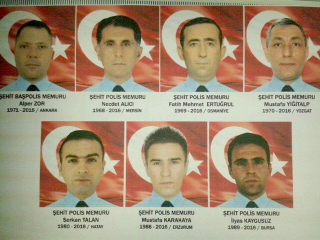 Diyarbakır'ın merkez Bağlar ilçesinde bomba yüklü araçla yapılan saldırıda şehit düşen polis memurları Alper Zor, Nejdet Alıcı, Fatih Mehmet Ertuğrul, Mustafa Yiğitalp, Serkan Talan, Mustafa Karakaya ve İlyas Kaygusuz için cenaze töreni düzenlendi. 8. Ana Jet Üs Komutanlığında basına kapalı gerçekleştirilen törene, Başbakan Ahmet Davutoğlu, eşi Sare Davutoğlu, Başbakan Yardımcısı Numan Kurtulmuş, Çalışma ve Sosyal Güvenlik Bakanı Süleyman Soylu, İçişleri Bakanı Efkan Ala, Milli Eğitim Bakanı Nabi Avcı, Sağlık Bakanı Mehmet Müezzinoğlu ve Ulaştırma Denizcilik ve Haberleşme Bakanı Binali Yıldırım, Kalkınma Bakanı Cevdet Yılmaz, Kültür ve Turizm Bakanı Mahir Ünal, AK Parti milletvekilleri, askeri ve mülki erkan ile şehitlerin yakınları katıldı.