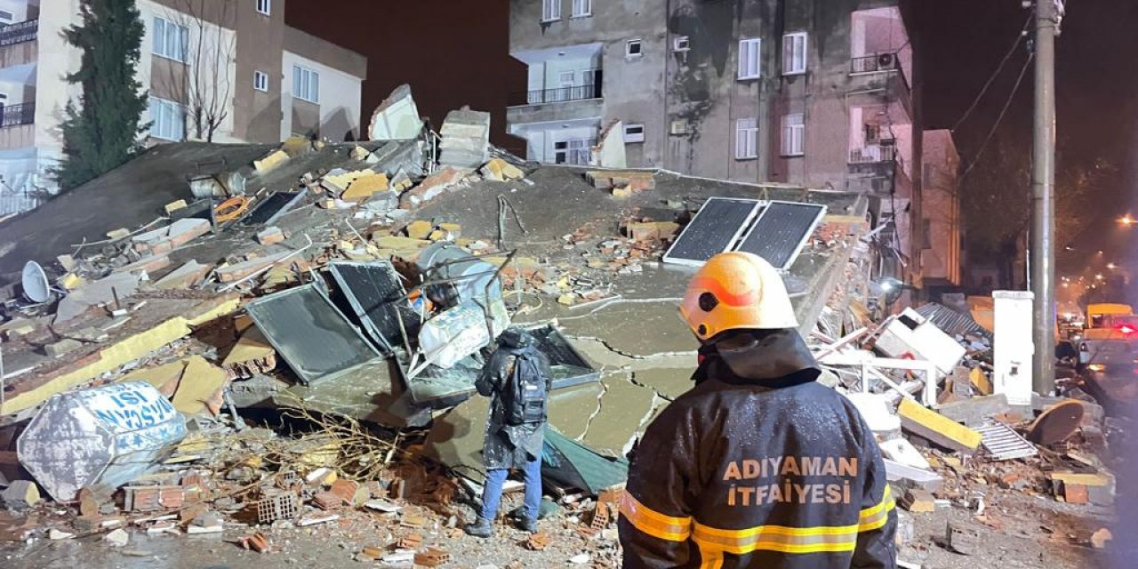 Pazarcık ve Elbistan merkezli 7,7 ve 7,6 büyüklüğündeki depremlerden etkilenen Adıyaman'da, Zey Caddesi 2325 Sokak'ta Hacı Şerif Camisi yakınındaki 5 katlı bina kendiliğinden çöktü.