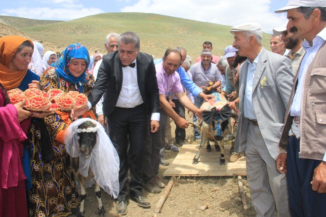 Daha sonra bir koyuna gelinlik giydiren Aydın ve beraberindekiler, damat olan koçu ise güzel bir şekilde süsledi. Kadınlar ellerindeki kına tepsileri ile ak koyunu Kürtçe şarkılar eşliğinde alana getirirken, diğer taraftan ise erkekler papyon takılan kara koçu bir tahta sedyede taşıyarak düğün alanına getirdiler. Burada ak koyun ve kara koç için takı merasimi yapıldı. Çıngıraklı zil, bir tepsi arpa ve çiçeklerin hediye edilmesinin ardından yöresel kıyafetli kadınlar gelin ile damadın etrafında bir süre davul zurna eşliğinde halay çektiler.