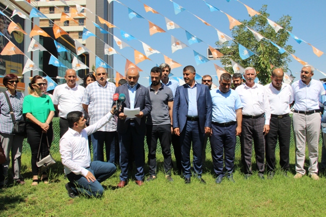 AK Parti Diyarbakır İl binası önünde dün yapılan açıklamaya AK Parti il yöneticileri ve partililer katıldı. Açıklamayı, AK Parti Diyarbakır İl Başkan Yardımcısı (Siyasi Hukuki işlerden sorumlu) Recep Çelik okudu.