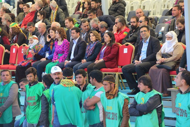 Yakın zamanda yürütülen barış sürecinden dersler çıkararak, eksiklerini cesaretle masaya yatırarak yol almamız lazım. Eğer siyaset bunu başaramazsa orada siyasetsizlik vardır. Biz bunun için seçildik, halkımızın acısı büyük yarası derin. Elbette bu direniş kazanana kadar devam eder. Ama şunu anlaması gerekiyor. Bugün Kürtler savaş derinleşsin diye direnmiyor savaşa karşı barış için direniyor. Asla bizim kitabımızda geri ödemek yoktur. Bedel ödetip sindireceklerini sanıyorlar tarihten hiç ders almamışlar demektir. Siyasetin bu kadar tıkandığı siyasetin çözüm sanatı olma noktasında işte Amed Newrozu bir kez daha yolumuzu açıyor. Burada bulunan herkes çözümün yolunu gösteriyor. Korkarak korkutarak asla hiç bir şey çözemezsiniz. Biz siyasi tarihimiz boyunca her zaman adil çözümlerin peşinde koştuk. Kimseye düşmanlık yapmadan ama bize düşmanlık yapanların karşısında dimdik durduk. Devlet aklı ferasetsiz kalmışsa kin ve öfke ile hareket ediyorsa kendi halkını felakete sürükler. Bu tür dönemlerde asıl olan şey ortak akıl ile hareket etmektir. Bizim çözüm önerilerimiz var bütün bunlara kulak vermek yerine akıl almaz bir tasfiye politikası yürütmek kimseye kazandırmaz. HDP bu ilkeler üzerine kurulmuş Kürt'ün hakkını inkar etmeden Türklerin hakkını inkar etmeden çözüm için kurulmuştur. Bu zemine saldırmak çözümsüz kalmaktır. Bugün hiç bir parti barış sözünü ağzına almıyor. Daha fazla savaş daha fazla operasyon diyen partilerden Türkiye'ye hayır gelmez.