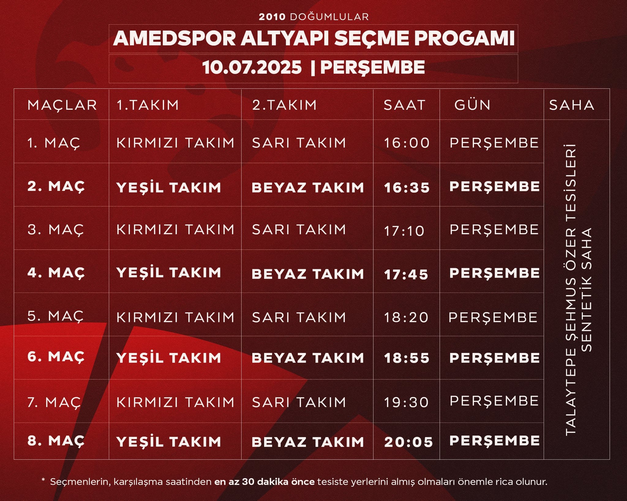 Minik sporcuların sahadaki heyecanına ailelerin de eşlik etmesi beklenirken, organizasyonun büyük ilgi görmesi bekleniliyor. Kulüpten yapılan açıklamaya göre, seçmelere katılacak sporcuların, karşılaşma saatinden en az 30 dakika önce tesiste hazır bulunmaları gerektiği önemle vurgulandı. Seçmeler kapsamında düzenlenecek müsabakalara ilişkin tarih ve saat bilgileri, sürecin ilerleyişine göre Amedspor’un resmi kanallarından duyurulmaya devam edecek. Diğer yaş grupları için planlama yapıldıkça ayrıca bilgilendirme yapılacağı belirtildi.
