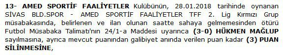 TFF 2. Lig Kırmızı Grup takımlarından mücadele eden Amed Sportif Faaliyetlere beklenen ceza geldi. Türkiye Futbol Federasyonu (TFF) Profesyonel Futbol Disiplin Kurulu, geçen hafta deplasmanda oynanması gereken Sivas Belediyespor maçına çıkmayan Amed Sportif Faaliyetlerle ilgili kararını açıkladı. Profesyonel Futbol Disiplin Kurul, Amed Sportif Faaliyetler Kulübünün, 28.01.2018 tarihinde oynanan Sivas Belediyespor - Amed Sportif Faaliyetler TFF 2. Lig Kırmızı Grup müsabakasında, belirlenen ve ilan olunan saatte sahaya gelmemesinden ötürü Futbol Müsabaka Talimatı'nın 24/1-a Maddesi uyarınca (3-0) hükmen mağlup sayılmasına, ayrıca mevcut puanından galibiyet anında verilen puan kadar (3) puan silinmesine, karar verdi.