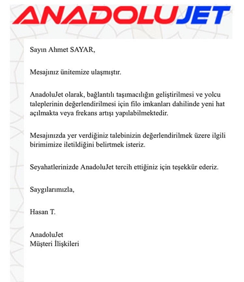 Konuyu sosyal medyada üzerinden AnadoluJet’e duyuran Ticaret ve Sanayi Odası Başkanı Ahmet Sayar’a yanıt geldi. AnadoluJet, Başkan Sayar’a gönderdiği yazıda, “AnadoluJet olarak, bağlantılı taşımacılığın geliştirilmesi ve yolcu taleplerinin değerlendirilmesi için filo imkanları dahilinde yeni hat açılmakta veya frekans artışı yapabilmektedir. Mesajınız da yer verdiğiniz talebinizin değerlendirmek üzere ilgili birimlerimize ilettiğimizi belirtmek isteriz” denildi.