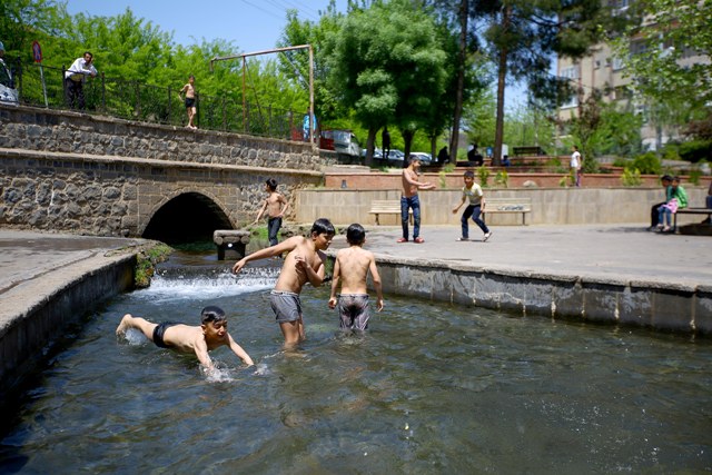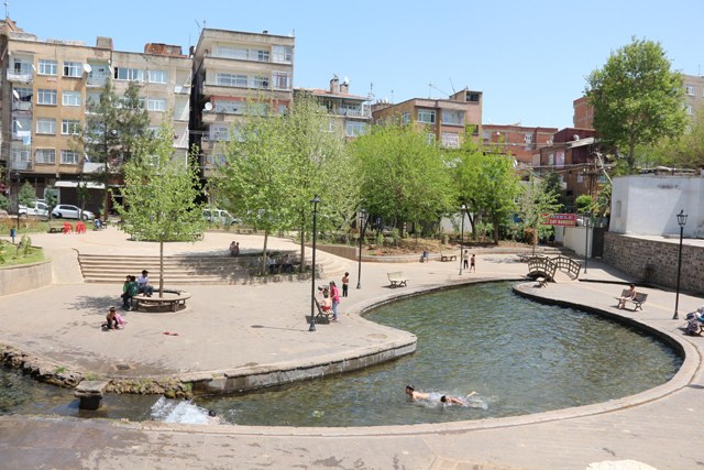 Anzele’nin efsanevi, şifalı ve bir zamanlar içinde rengârenk balıkların yüzdüğü havuzda şimdilerde Sur’un çocukları serinliyorlar.