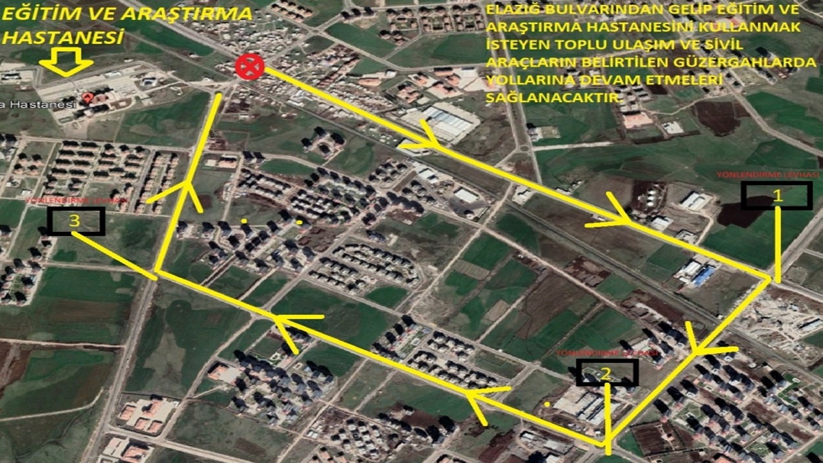 Gazi Yaşargil Eğitim ve Araştırma Hastanesine gidecek olan toplu ulaşım ve sivil araçlar, Elazığ Bulvarı, Mezopotamya Bulvarı, Mastfroş Caddesi ve Prof. Dr. Necmettin Erbakan Bulvarı’nı kullanabilecek. (Haber Merkezi)