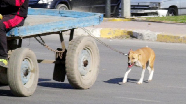 Eyyübiye Mahallesi'nde hareket halindeki at arabasının arkasına demir zincirle bağlanan köpeği görenler şaşırdı. At arabasının arkasına bağlanan köpeğiyle birlikte atını koşturan genç, yoldan geçen araç sürücülerinin tepkilerine aldırış etmeyerek, yoluna gülerek devam etti. At arabasının yasak olduğu kentte ana caddelerde polis ve zabıta ekiplerine yakalanmadan dakikalarca köpeğe eziyet eden sürücü bir süre sonra sokak aralarına girerek gözden kayboldu. Koşmaktan bitkin düşen köpeği görenler, at arabacı sürücüsüne klakson çalıp tepki gösterdi.
