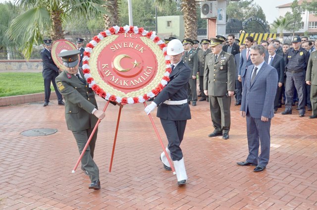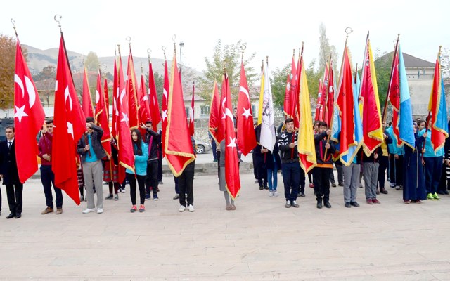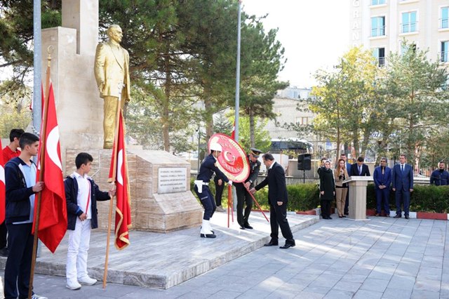 Cumhuriyet meydanında düzenlenen törende, İlçe Kaymakamı Dr. Vural Karagül, Belediye Başkanı Resul Yılmaz ve 107. Topçu Alay Komutanı Albay Behiç Kunaç tarafından Atatürk Anıt'ına çelenk konuldu. Saatin 09.05'i göstermesiyle 2 dakika boyunca sirenler çaldı. Törene katılanlar saygı duruşunun ardından İstiklal Marşı okudu.