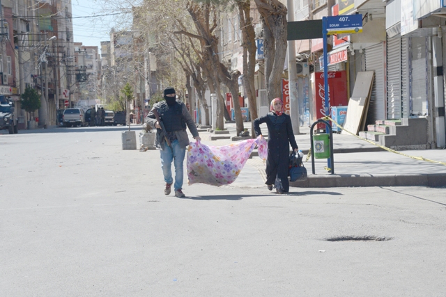 Diyarbakır'ın merkez Bağlar İlçesi Kaynartepe Mahallesi'nde 15 Mart günü sokağa çıkma yasağı ilan edilen Kaynartepe Mahallesi'nde hendeklerin kapatılması ve barikatların kaldırılması için operasyonlar sürüyor. Geçtiğimiz gün askerlerin de zırhlı araçlarla destek verdiği operasyonlarda, daha önce PKK üyelerinin kullandığı belirtilen evlerde yapılan aramalarda keskin nişancı tüfeği Kanas'ların da bulunduğu çok sayıda silah, roketatar, bomba yapımında kullanılan malzeme ve mühimmat ele geçirildi. Mahallede bulunan ve bomba tuzaklı barikatlar emniyetli bir şekilde imha çalışmaları devam ederken, askerler zırhlı araçlarla stratejik bölgelerde konuşlandırıldı. Gün boyu mahalle üzerinde uçuş yapan helikopterlerin aldığı görüntüler de anında kriz masasına iletiliyor.Operasyonların sürdüğü Koşuyolu Caddesi üzerinde bulunan yaya üst geçidine Türk bayrakları asıldı.