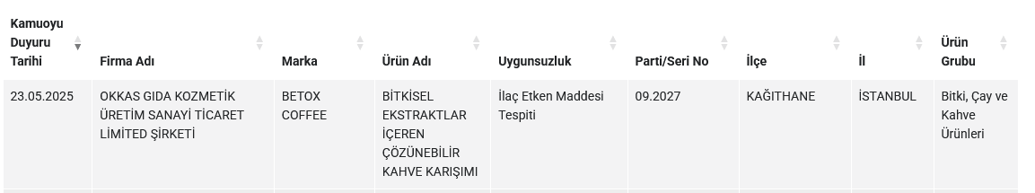 TİGRİS HABER - OKKAS Gıda Kozmetik Üretim ve Sanayi Ticaret Limited Şirketi tarafından üretilen Betox Coffee adlı üründe ilaç etken maddesi tespit edildi!