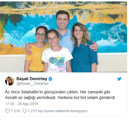Twitter hesabından paylaşım yapan Başak Demirtaş, "Az önce Selahattin'in görüşünden çıktım. Her zamanki gibi moralli ve sağlığı yerindeydi. Herkese bol bol selam gönderdi" dedi. (demokrat haber)