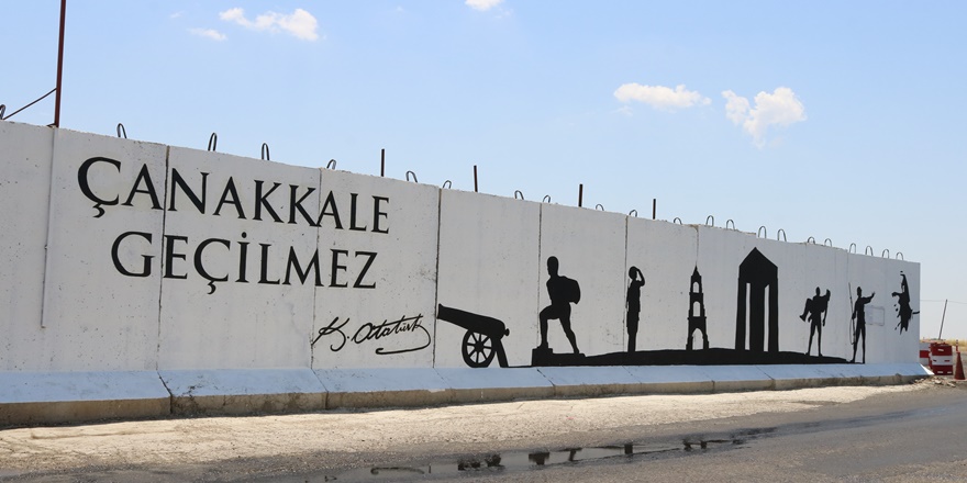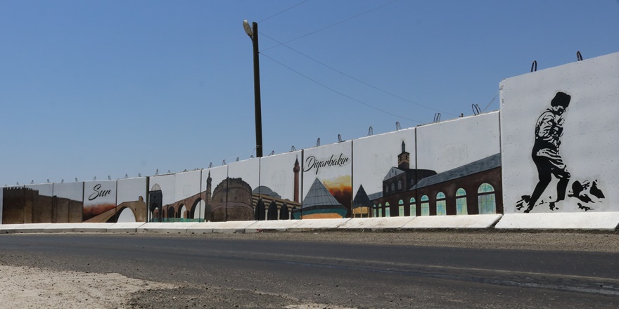 Diyarbakır’ın Sur ilçesinde Mermer Jandarma Karakolu önündeki kontrol noktasında bulunan beton bloklara, Diyarbakır’ın tanıtımı için kentin tarihi dokuları resmedildi.