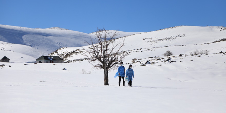 Bingöl'de yaşlıları ev ortamında aşılamak için adreslerine giden sağlık ekipleri, il ve ilçe merkezlerinin yanı sıra kırsal ve yüksek kesimlerde kar yağışının yoğun olduğu bölgelerde de aşı çalışmalarını sürdürüyor. Sağlık ekipleri karlı dağları aşarak, bazen de araçlarını bırakıp metrelerce yol kat ederek, yaşlıları Kovid-19'a karşı korumak için aşı çalışmasını büyük bir öz veriyle yapıyor.
