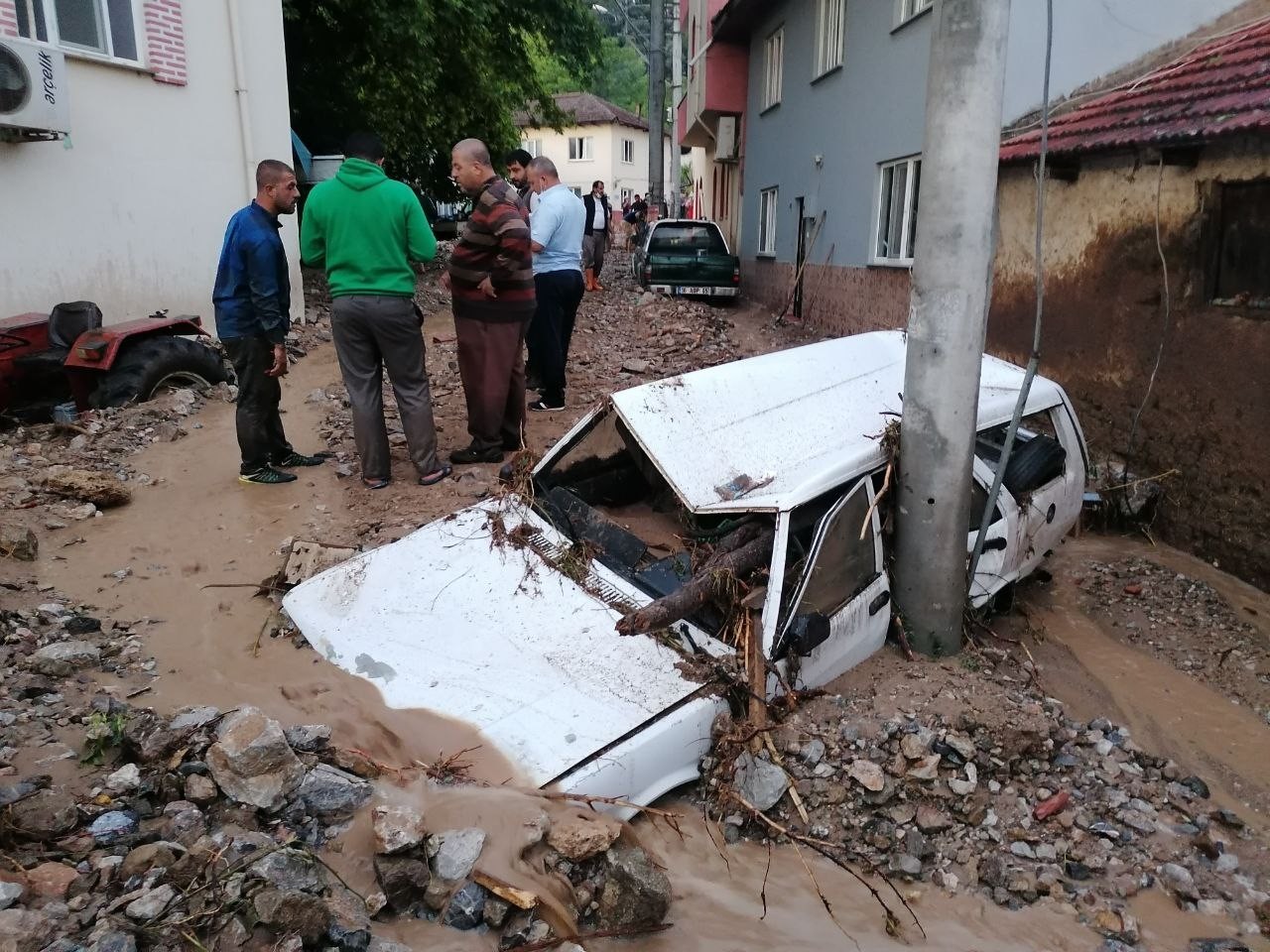 Köydeki onlarca otomobil, traktör, kamyonet ve römork da sel sularından nasibini aldı. Azgın sular yukarıdan aşağıya çok sayıda aracı sürüklerken, araçlar kullanılamaz hale geldi.