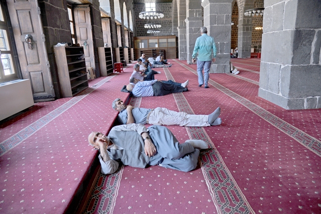 Diyarbakır'da etkili olan aşırı sıcaklar havada bunalanlardan bir bölümü su kaynaklarında serinlemeye çalışırken bazıları da kentteki tarihi camilerde uyuyarak sıcak saatleri atlatmaya çalışıyor. Sur içindeki tarihi Ulu Cami'ye özellikle öğle saatlerinde gelenler ibadet ettikten sonra uyuyor.