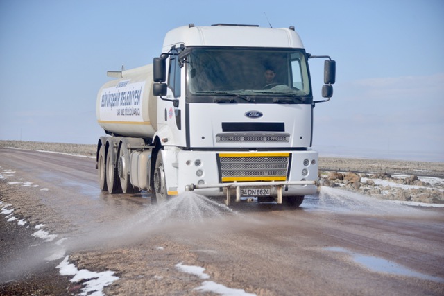 Yol bakım ve onarım çalışmalarını sürdüren Büyükşehir Belediyesi, yollarda oluşan buzlanmaya karşı buz çözücü solüsyon kullanmaya başladı.