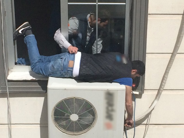 Diyarbakır'ın Yenişehir ilçesi Yaşar Kemal Caddesi üzerinde bulunan bir binanın 5. katının penceresinden sarkarak klimayı tamir etmeye çalışan işçi, can güvenliğini tehlikeye attı. Pencereden dışarı sarkan ve tamir etmeye çalıştığı klimanın üzerine uzanan işçi, bina içinde bulunan bir arkadaşı tarafından tutularak işini yaptı. Dakikalarca süren tamiratta binanın dış duvarına monte edilmiş klimanın üzerine uzanarak çalışan işçi yürekleri ağızlara getirdi.(İHA)