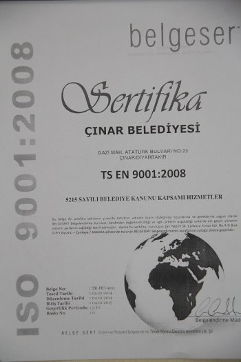 DİYARBAKIR’ın Çınar İlçe Belediyesi’nin Uluslararası Standardizasyon Örgütü'nün oluşturduğu kalite yönetim standardı olan ISO 9001 Belgesi için 2011'de yaptığı başvuru sonuçlandı. Başvuru sonucu periyodik olarak yapılan "uluslararası kalite yönetim standardı" denetimlerinde "standartlara uygun kaliteli hizmet ve yönetim" sağladığı tescillenen Çınar Belediyesi, 3 yıl süren standartlaşma çalışmalarını tamamlayarak, girdiği denetimlerin ardından TSE ISO 9001 kalite yönetimi belgesini aldı.