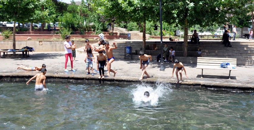 Termometrelerin 39 dereceyi gösterdiği Diyarbakır’da sıcaktan bunalan çocuklar süs havuzlarına akın etti.