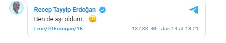 Erdoğan, Telegram hesabında "Ben de aşı oldum" mesajını paylaştı.