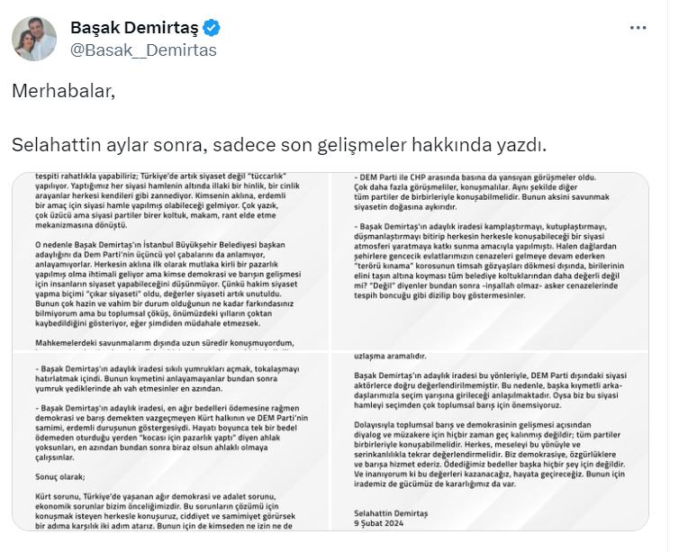 TİGRİS HABER - Başak Demirtaş’ın paylaştığı açıklamada Selahattin Demirtaş’ın hem gündemdeki ittifak ve yerel seçim konuları hem de Başak Demirtaş’ın adaylıktan çekilmesine ilişkin görüşü yer aldı.