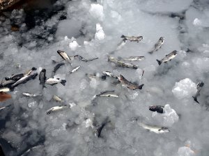 HAKKARİ- Hakkari'de dereye çığ düşmesi sonucu su kaynağı kesilen ve oksijensiz kalan binlerce alabalık telef oldu.