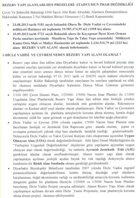 "Diyarbakır Büyükşehir Belediyesi tarafından 2007 yılında Dicle Vadisi regratif potansiyellerini değerlendirilmesi, kentin ihtiyaç duyduğu yeşil alanların karşılanması, doğal ekosistemin varlığı ve sürdürebilirliği amacıyla koruma/kullanma dengesini güden bir planlama ilkesiyle 1/25000 ve 1/5000 Nazım imar planları hazırlanıp, Dicle Vadisi projesi yarışma edilmiştir. Alanın Rezerv Yapı Alanı olarak yapılaşmaya açılması devam eden Dicle Vadisi projesinin, imar planlarıyla koruma altına alınan projeyi olumsuz etkileyecektir."