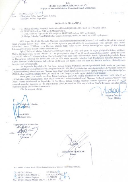 "Kordinat listesi belirtilen, mülkiyete maliye hazinesine ait toplamda 10.985.474.95 metrekare yüz ölçümüne sahip taşınmazların 6306 sayılı kanunun ikinci maddesinin birinci fıkrasının (c) bendi uyarınca 'Rezerv Yapı Alanı' olarak belirlenmesi ve Diyarbakır ili, Sur ilçesi, Yukarı Kılıçtaş Mahallesi sınırları içerisinde yer alan, 67 ve 90 numaralı parselleri kapsayan ve ilgi (b)'de kayıtlı 23/ 05/ 2013 tarih ve 2516 sayılı makam oluru ile rezerv yapı alanı olarak belirlenen hususları, olurlarınıza arz ederim."