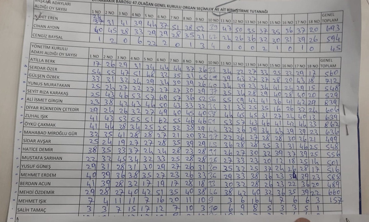 Diyarbakır Barosu’nun 47’inci Genel Kurul seçimlerinde sabah saat 09:00’da başlayan oy verme işlemi 17:00’da sona erdi. Açılan sandıkların sayımının ardından Diyarbakır Barosu’nun yeni başkanı belli oldu. Başkanlık için yarışan adaylardan Cihan Aydın, Nahit Eren ve Cengiz Baysal’ın aldıkları oylar belli oldu. Seçimlerde 693 delegenin oyunu alan Nahit Eren kesin olmayan sonuçlara göre Diyarbakır Barosu’nun yeni başkanı oldu. Seçimlerde Cihan Aydın ise 594 oy aldı. Av. Cengiz Baysal da 45 oyda kaldı.