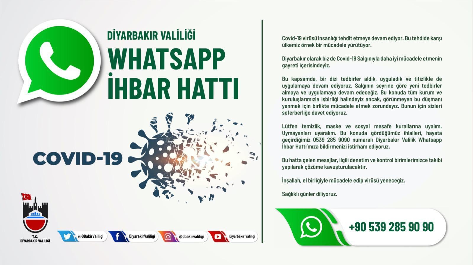 Konuyla ilgili Diyarbakır Valisi Münir Karaloğlu yazılı bir açıklama yaptı. Yapan yazılı açıklamada, “Covid-19 virüsü insanlığı tehdit etmeye devam ediyor. Bu tehdide karşı ülkemiz örnek bir mücadele yürütüyor. Diyarbakır olarak biz de Covid-19 Salgınıyla daha iyi mücadele etmenin gayreti içerisindeyiz. Bu kapsamda, bir dizi tedbirler aldık, uyguladık ve titizlikle de uygulamaya devam ediyoruz. Salgının seyrine göre yeni tedbirler almaya ve uygulamaya devam edeceğiz. Bu konuda tüm kurum ve kuruluşlarımızla işbirliği halindeyiz ancak, görünmeyen bu düşmanı yenmek için birlikte mücadele etmek zorundayız. Bunun için sizleri seferberliğe davet ediyoruz. Lütfen temizlik, maske ve sosyal mesafe kurallarına uyalım. Uymayanları uyaralım. Bu konuda gördüğümüz ihlalleri, hayata geçirdiğimiz 0539 285 9090 numaralı Diyarbakır Valilik Whatsapp ihbar Hattı'mıza bildirmenizi istirham ediyoruz. Bu hatta gelen mesajlar, ilgili denetim ve kontrol birimlerimizce takibi yapılarak çözüme kavuşturulacaktır. İnşallah, el birliğiyle mücadele edip virüsü yeneceğiz. Sağlıklı günler diliyoruz” denildi.
