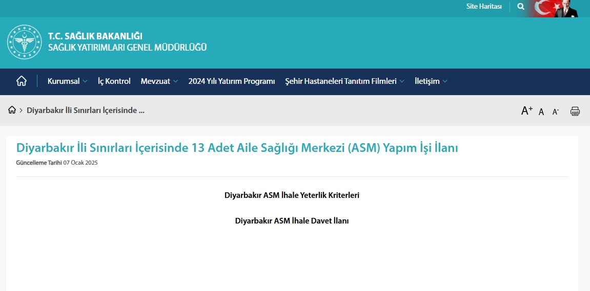 TİGRİS HABER - Sağlık Bakanlığı, Dünya Bankası destekli Türkiye Deprem Sonrası İyileşme ve Yeniden İmar Projesi kapsamında Diyarbakır’da 13 adet Aile Sağlığı Merkezi (ASM) inşası için ihaleye çıkıyor. Karapınar, Ergani, Bağlar, Bismil, Sur ve Çınar ilçelerinde yapılacak merkezler, 240 gün içinde tamamlanacak.