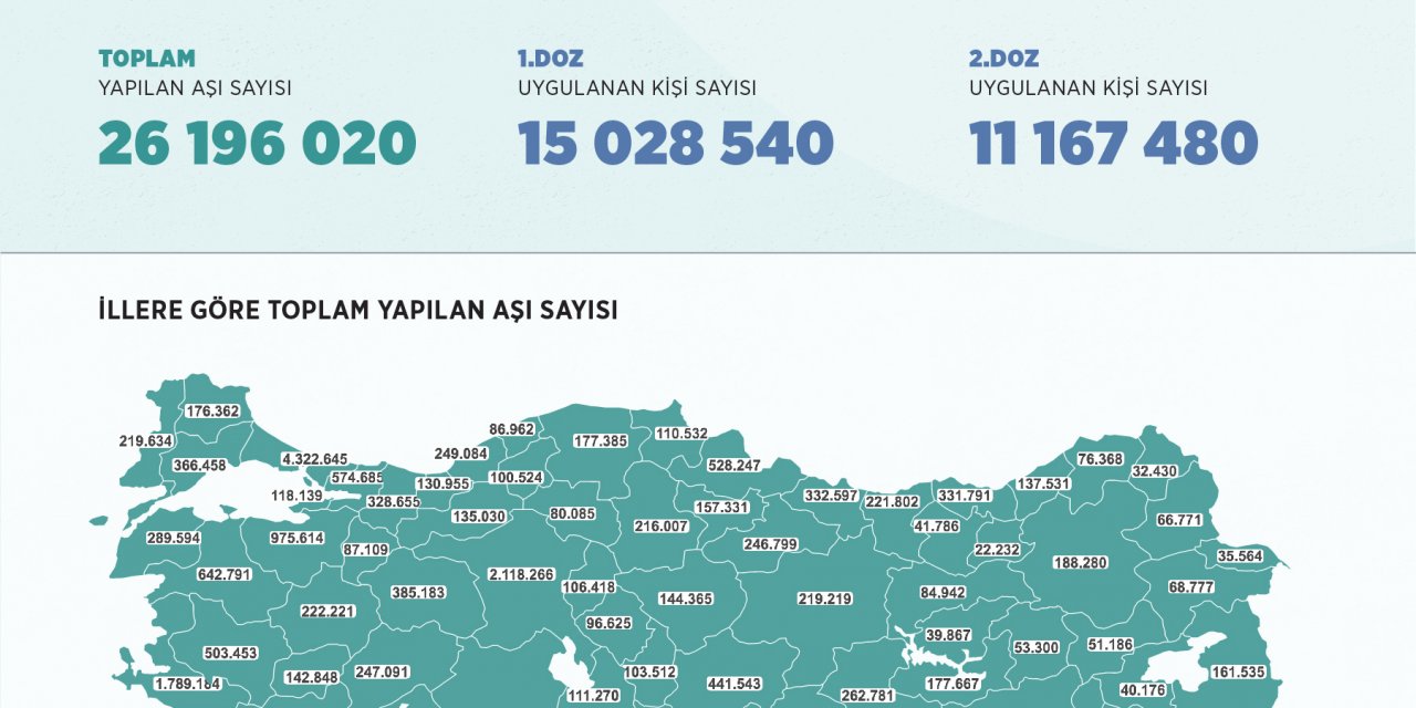 Türkiye'de bugüne kadar 26 milyon 196 bin 20 doz Kovid-19 aşısı yapıldı. 15 milyon 28 bin 540 kişiye ilk doz, 11 milyon 167 bin 480 kişiye de ikinci doz aşılar uygulanırken Diyarbakır’da ise 239 bin 101 aşı yapıldı.