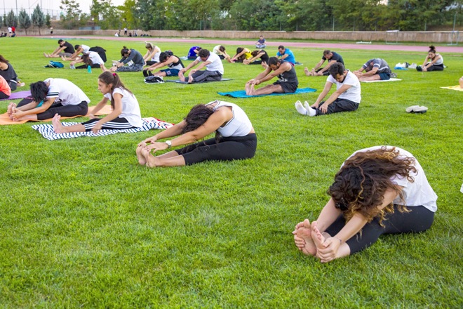 Gençlik ve Spor İl Müdürlüğünün de desteğiyle bayram tatilinin yorgunluğunu atmak veya yoga ile ilk defa tanışmak isteyen meraklılar, matlarıyla atletizm pistinde bir araya geldi.