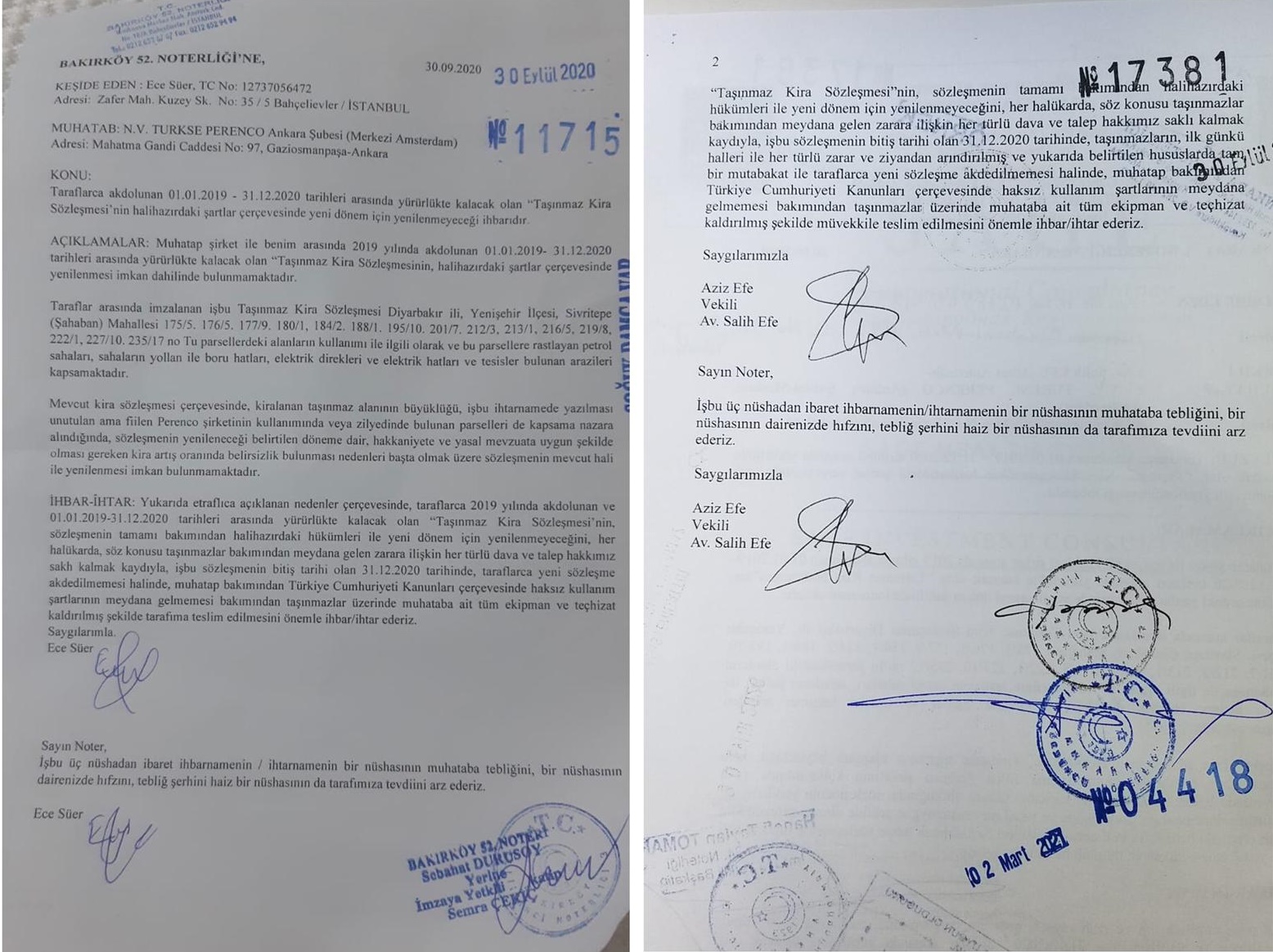 Konuyla ilgili arazi sahibi köylülerin akrabası ve aynı zamanda avukatları olan insan hakları ve uluslararası hukuk alanında çalışan avukat Salih Efe, Perenco petrol şirketiyle 5 aydır müzakerelerin devam ettiği, 5 ay önce kira sözleşmesinin yılbaşında sona ereceği konusunda gerekli ihtarnamelerin çekildiğini belirtti.