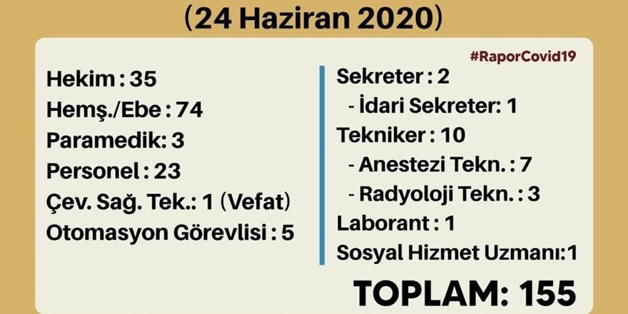 Diyarbakır’daki enfekte sağlıkçı sayısında da hızlı bir artış izlendiğinin ifade edildiği açıklamada, şu veriler paylaşıldı: “Diyarbakır’da 24 Haziran 2020 itibariyle tespit edebildiğimiz Covid-19 testi pozitif sağlıkçı sayısı 155, vefat sayısı 1’dir (35 hekim, 74 hemşire, 23 personel, 7 anestezi teknikeri, 5 otomasyon görevlisi, 3 radyoloji teknikeri. 3 paramedik, 2 sekreter, 1 çevre sağlığı teknisyeni(vefat), 1 laborant, 1 sosyal hizmet uzmanı).”