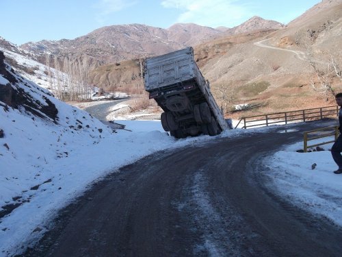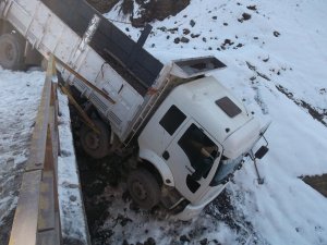 Diyarbakır- Diyarbakır’ın Kulp ilçesinde buzlu olan yolda sürücüsünün direksiyon hakimiyetini kaybettiği kamyon yoldan çıkarak kaza yaptı.