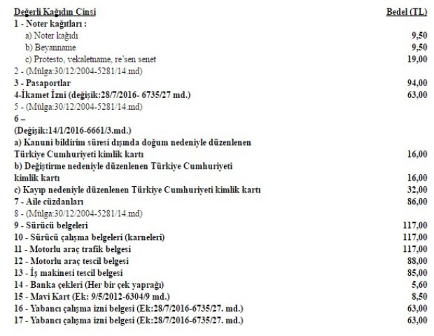 Değiştirme nedeniyle verilen TC kimlik kartları için 16 TL, eğer kayıp nedeniyle düzenleniyorsa 32 TL bedel öngörülüyor. Gelecek yıl, noter kağıtları ve beyanname için 9.50 TL, protesto, vekaletname ve re’sen senet için 19 TL, her bir banka çeki yaprağı için ise 5.60 TL bedel ödenecek.