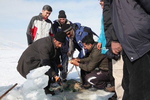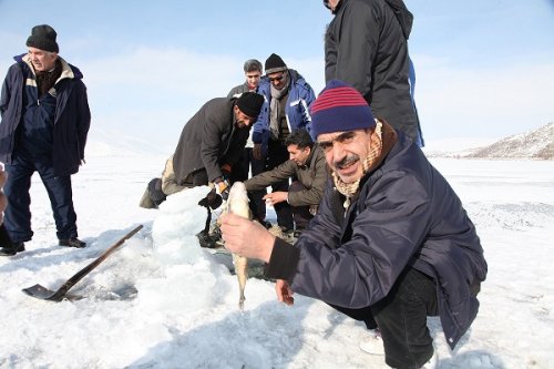Kar ve buzlanmaya rağmen kilometrelerce yol keteden balıkçılar göl üzerinde bulunan 30 santimetrelik buzu kırıp ağlarını soğuk sulara bırakırken, Ahlat Dağcılık ve Doğa Sevenler Derneği ise bu meşakkatli işi merakla izledi. Balıkçılarla beraber kilometrelerce yol yürüyen dernek üyeleri, donan gölde zorlu balık avını izlerken çatlayan buzlardan dolayı tedirginliğe kapıldı. Göl üzerinde avlanmayı sadece sofralarına birkaç balık götürmek için yaptıklarını anlatan balıkçılar, bin bir zahmetle balık avına çıktıklarını belirterek, "Göle en yakın yerleşim alanının 5 kilometre mesafe bulunuyor. Yapacak başka bir işimiz yok. Tek geçim kaynağımız balıkçılık. Bizler Nazik Gölü'nden çıkardığımız aynalı sazan balığı ile sofralarımıza bırakıyoruz. Aralık ayında donan göl, nisan ayının sonlarına kadar ancak çözülüyor. Kazma ve küreklerle buz kırıyoruz. Çok olmasa da çıkardığımız balıklar sofralarımızda karnımızı doyurmaya yetiyor. Bazen eli boş, bazen de günde bir kaç balık avlayarak evimize dönüyoruz. Bugün ise gün boyu balık avına çıktık fakat birkaç tane balık avlayabildik. Gün boyu eksi -5, -10 derecede suya ağ atarak balık avlıyoruz. Elimiz adeta buz kesiyor. Balık avını senede bir iki kez sadece günlük nafakamız için geliyoruz” dedi.