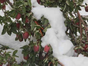 Bahçeleri zarar gören çiftçiler, kırılan meyve ağaçlarını bir tarafa toplayarak kar altında kalan meyveleri toplamanın telaşına düştü.