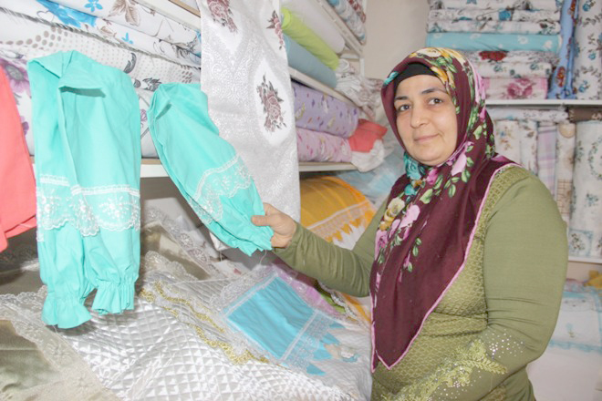Okuma yazma kurlarıyla birlikte dikiş-nakış kursuna da katıldığını söyleyen Aras, “Kursa gittim, güzel ürünler ortaya çıkardık. Heves oldu dükkan açmaya karar verdim. Zaten eşim çalışmadığı için ihtiyacım da vardı. Eşim çalışmadığı için hem bir yandan aileme maddi destekte bulunmak hem de bir yandan da bu hepimizin mesleği oldu. Gelinim, ben, eşim beraber oturuyoruz şimdi. İş sahibi olan başka insanlara çok özenirdim ama hiç aklımdan geçmezdi, hayal bile etmemiştim iş yerim olacağını. Bu kurslar sayesinde hayalim gerçekleşti. Kendi iş yerimin sahibi oldum. Borcum çok ama yine de olsun yavaş yavaş çalışır öderim. Sıfırdan başladım elimde bir şey olmadığı için. Oradan buradan eşya getiriyorum borç olarak elime geçtikçe azar azar ödemeye çalışıyorum. İlk başlarda evde çalışıyordum daha sonra kimse görmüyor diye dükkan açtık. İyi de oldu. Namazlıktan çocuk battaniyesine, gelin setlerine kadar her çeşit şey yapıyoruz” diye konuştu.