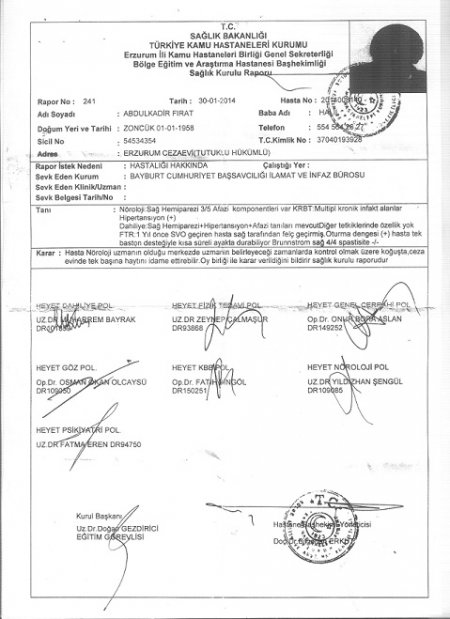 konulan Fırat, bir süre tedavi gördü. Ardından Bayburt M Tipi Kapalı Cezaevi'ne sürgün edilen Fırat'a sağ tarafı tutmadığı ve yaşamsal ihtiyaçlarını karşılayamadığı halde, "Nöroloji uzmanın belirleyeceği zamanlarda kontrol olmak üzere koğuşta ve cezaevinde tek başına hayatını idame ettirebilir" raporu verildi.