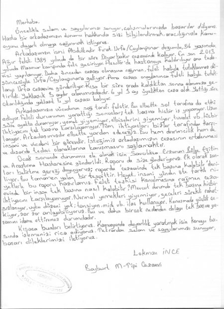 DİYARBAKIR - İnsan Hakları Derneği'nin (İHD) hasta tutuklulara ilişkin yapmış olduğu tespit çalışmalarının ardından yayınladığı ve sürekli güncellenen rapora göre, cezaevlerinde sayıları 550'yi bulan hasta tutuklu var. Aynı raporda 163 tutuklu ise ağır hasta kategorisinde yer alıyor ve hastalıklarının ölümcül riskler taşıdığı belirtiliyor. Bayburt M Tipi Kapalı Cezaevi'nde tutulan hasta tutuklu Abdulkadir Fırat'la (56) vücudunun sağ tarafını kullanamıyor ancak arkadaşlarının yardımı ile yaşamını idame ettiriyor. 3 ay önce Urfa'nın Ceylanpınar ilçesinde gözaltına alınan Fırat, tutuklanarak Şanlıurfa E Tipi Kapalı Cezaevi'ne gönderildi. Bir ay Şanılurfa Cezaevi'nde kaldıktan Sonra Bayburt M Tipi Kapalı Cezaevi'ne sürgün edilen Fırat, tutuklandıktan 3 ay sonra yargılanmak üzere mahkemeye çıkarıldı. Mahkemeye çıkarılan Fırat "örgüt üyesi" olduğu gerekçesiyle 6 yıl 3 ay hapis cezasına çarptırıldı. Fırat'ın Ocak ayında savcılık tarafından durumu göz önünde bulundurularak Erzurum Bölge Eğitim ve Araştırma Hastanesi'ne gönderildi.