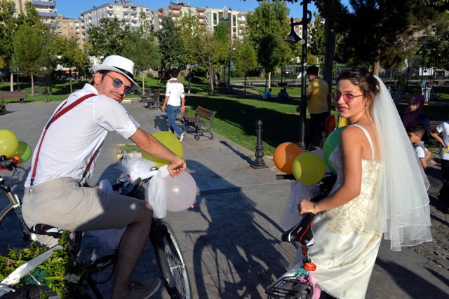 Gelin Özge Özgörüş ise, "Aileler arası biraz problemler oldu. Ben Denizliliyim eşim Diyarbakırlı. Şimdi her şey tatlıya bağlandı. Spor olarak da bisikletle uğraşıyoruz. Diyetisyen olduğum için spor benim için önemlidir. Böyle bir şey düşündük. Tur yapalım dedik. Farkındalık açısından ve güzel bir görüntü olsun diye yaptık. Şehir içinde de bu kadar araç yoğunluğunda bisikletin önemini vurgulamak istedik. Böyle bir şey düşündük" diye konuştu.