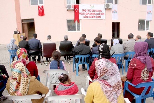 Genç çiftçilere 72 düve dağıtımı için düzenlenen törene, Ergani Kaymakamı Mehmet Ali Gürbüz, Diyarbakır Gıda Tarım ve Hayvancılık Müdürü Mustafa Ertan Atalar, İl Müdür Yardımcısı Mehmet Şefik Türker, Kırsal Kalkınma ve Örgütlenme Şube Müdürü Bayram Sevinçer, Ergani İlçe Müdür ve teknik elemanları ile çiftçiler katıldı. Proje kapsamında Ergani İlçesinde 12 adet Büyükbaş, 5 adet Küçükbaş ve 5 adet bitkisel üretim projesi olmak üzere toplamda 22 adet projeden 17 adeti tamamlanmış olup 510.000 TL. hibe ödemesi yapılmıştır. 31 Ekim 2016 tarihinde Ergani İlçesinde 12 genç çiftçiye kişi başı 6 büyükbaş olmak üzere toplamda 72 büyükbaş hayvan Ergani Kaymakamlığı ve Gıda Tarım ve Hayvancılık İl Müdürlüğü tarafında düzenlenen törenle teslim edildi. Tarım da sürdürülebilirliğin sağlanması, genç çiftçilerin girişimciliğinin desteklenmesi, gelir düzeyinin yükseltilmesi, alternatif gelir kaynaklarının oluşturulması ve kırsalda genç nüfusun istihdamına katkı sağlanması amacıyla yapılan törende Ergani Kaymakamı Mehmet Ali Gürbüz ile Gıda Tarım ve Hayvancılık İl Müdürü Mustafa Ertan Atalar birer konuşma yaptılar.