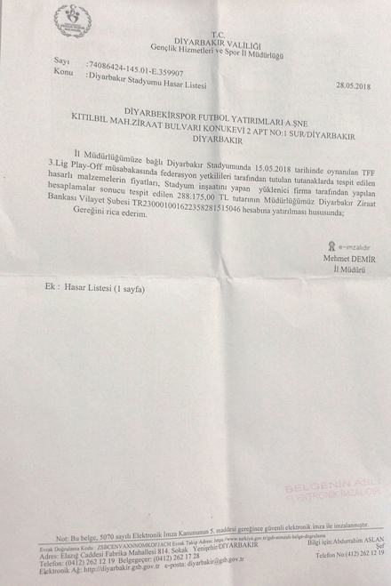 Diyarbakır Gençlik Hizmetleri Ve Spor İl Müdürlüğü, Play-Off maçında “taraftarlar stada zarar verdi” gerekçesiyle Diyarbekirspor’dan 288 bin TL talep etti.