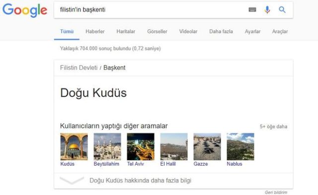 İslam İşbirliği Teşkilatı'nın dün İstanbul'da gerçekleştirilen olağanüstü toplantısının sonuç bildirisinde Filistin'in başkenti olarak Doğu Kudüs'ün tanınmasının ardından bugün Google'da harekete geçti. Google, Filistin'in başkentini arayanlara Doğu Kudüs sonucunu veriyor.