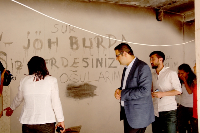 Sur’un Dabanoğlu mahallesinde DBP, HDP heyetinin incelemeleri sırasında, tahrip edilen ve çöplüğe çevrilen evlerin duvarlarının da çeşitli yazılarla dolu olduğu gözlendi. ‘JÖH, PÖH burada siz neredesiniz’, ‘Uzun adam burada Sur Birol’da 61,’ ‘Bize Sur da Trabzon’, ‘Biji T.C.’ yazılıları dikkat çekti. Harabeye çevrilen evlere kokudan girilemezken, vatandaşlar evlerinde çıkardıkları üç beş parça yatak, yorganla evlerini terk ettiler.